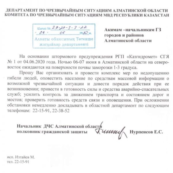 На основании штормового предупреждения РГП «Казгндромет» СГЯ № 1 от 04.06.2020 года. Ночью 06-07 июня в Алматинской области на северо-восток ожидаются на поверхности почвы заморозки 1-3 градуса.