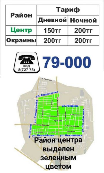 С 3-го мая 2019 года мы запускаем новую службу «Эконом такси», которая предоставит услуги такси по Чундже, по району, курьерские услуги, развозку и т.д. А также приглашаем водителей с личным авто к сотрудничеству и стабильному заработку. Мы предполагаем, что на начальных этапах могут быть трудности со временем подачи и выполнением заказов пока мы не наберем достаточное количество водителей, поэтому заранее приносим свои извинения если возникнут ситуации с долгим ожиданием такси. Как и в любой другой деятельности мастерство приходит с опытом и временем. Наши тарифы мы указали на визитках и приложили к этому объявлению. Проезд по центру будет составлять 150 тг, по окраинам 200 тг. Мы будем рады служить и быть полезными для наших жителей, надеемся на вашу поддержку и на то, что «Эконом такси» действительно будет для вас удобным и экономным. Пусть нам с Вами всегда будет по пути, а мы со словами «бисмиляхи рахмани рахим» начинаем свою службу.